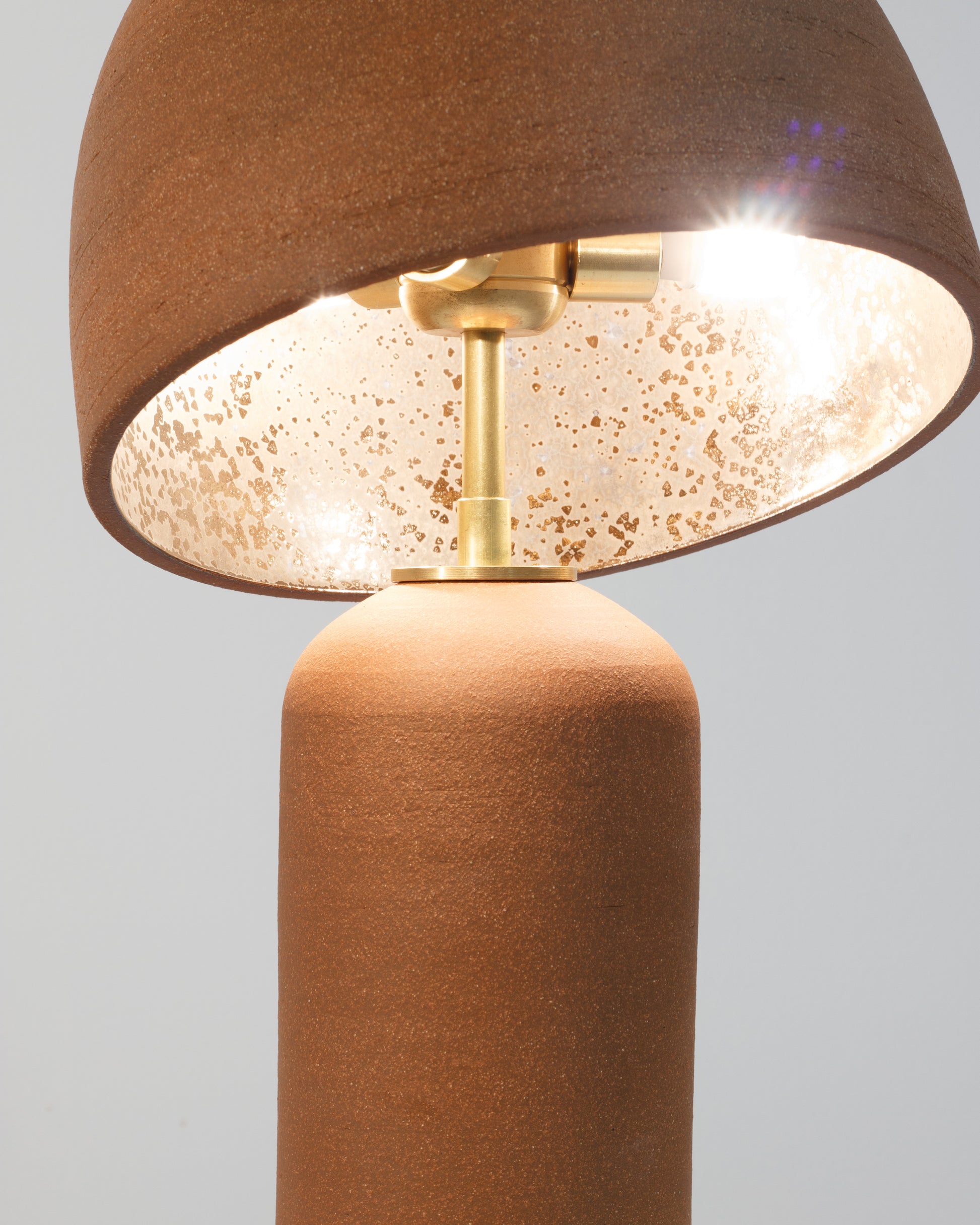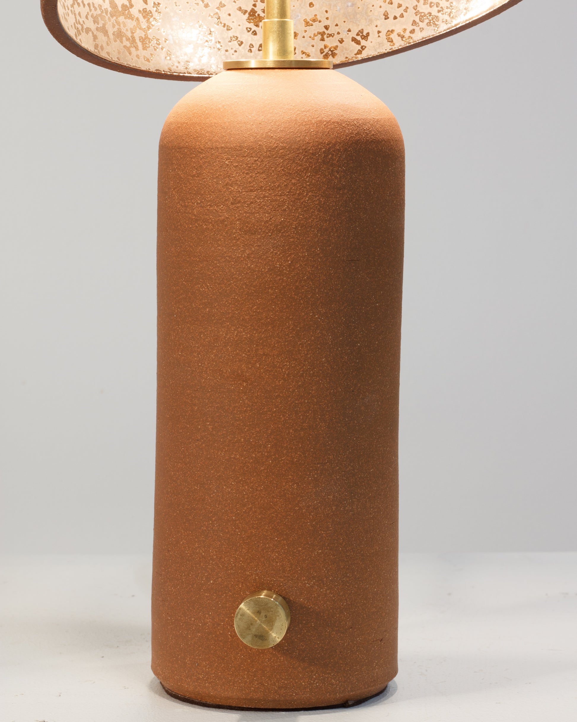 Lamp is a wheel thrown base & shade, wired and assembled using solid brass hardware by Cameron. Each piece is one of a kind, signed by the artist.