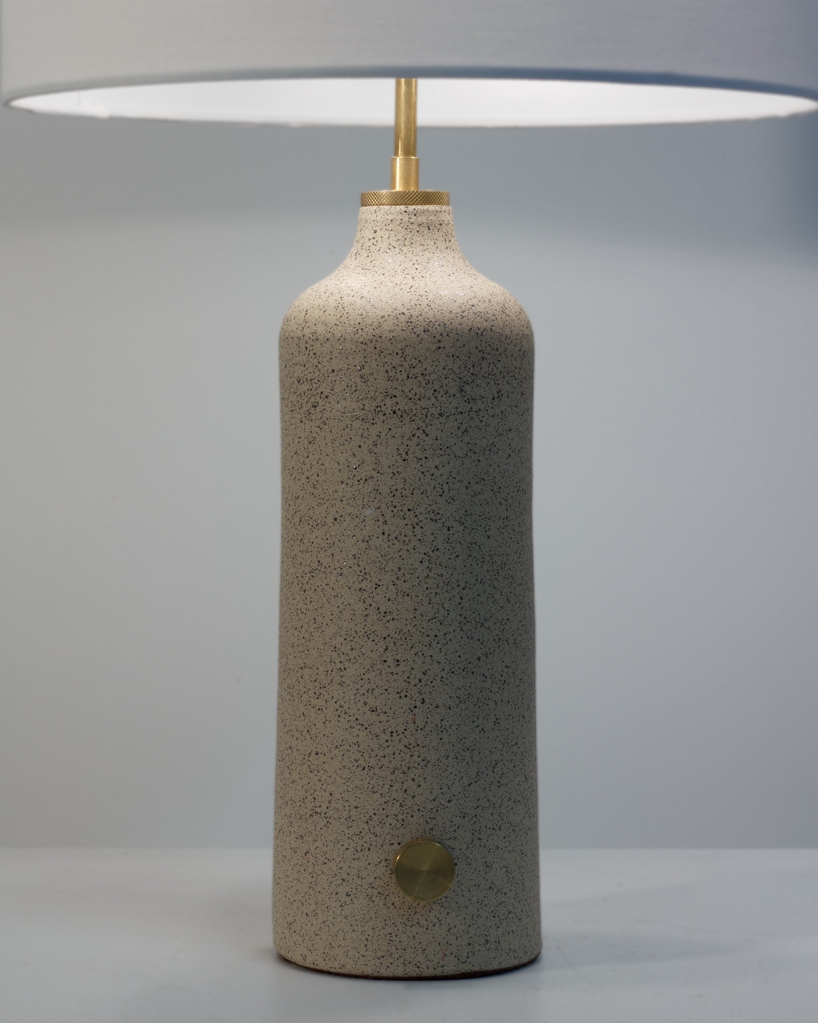 Lamp is a wheel thrown base, wired and assembled using solid brass hardware by Cameron. Each piece is one of a kind, signed by the artist.