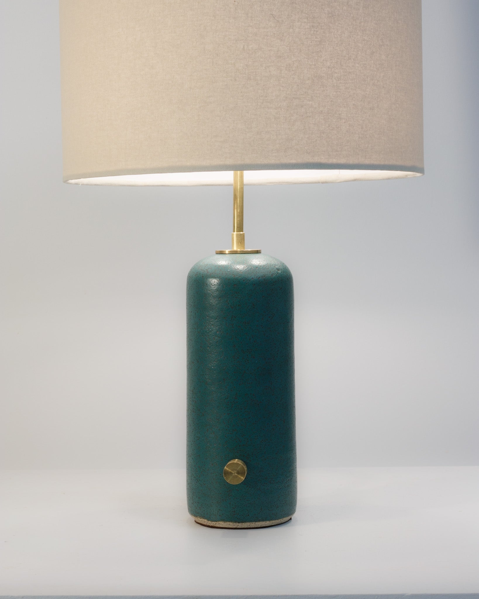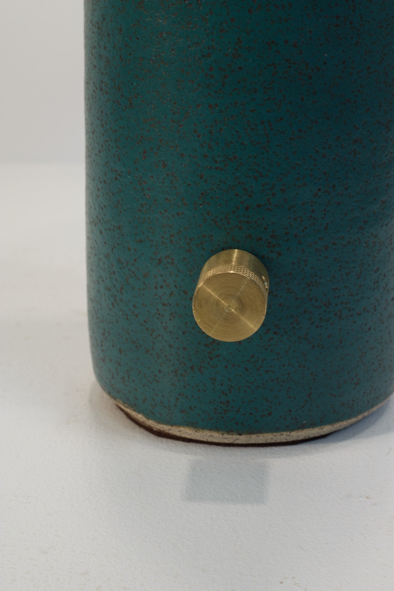 Lamp is a wheel thrown base, wired and assembled using solid brass hardware by Cameron. Each piece is one of a kind, signed by the artist.