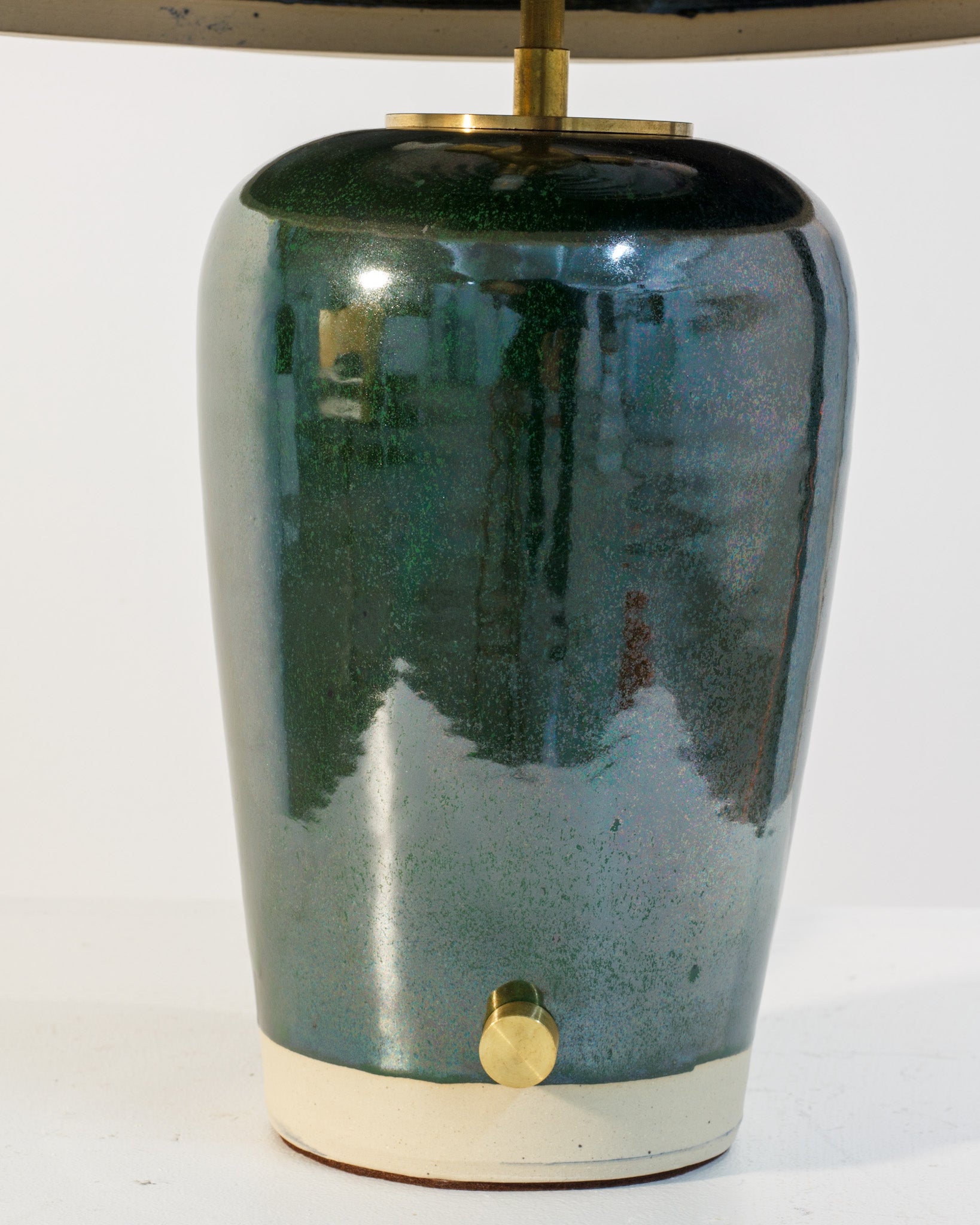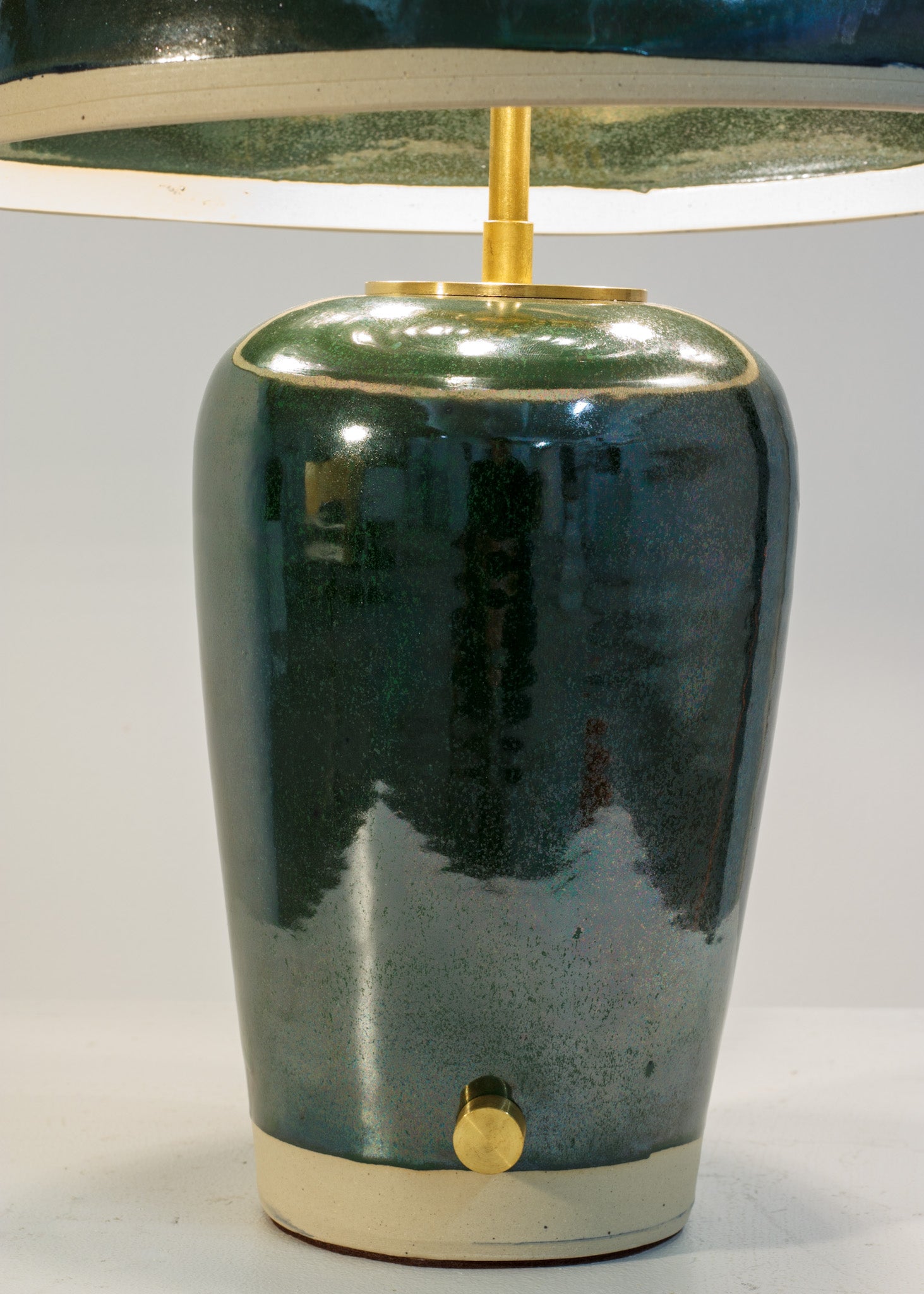Lamp is a wheel thrown base and shade, wired and assembled using solid brass hardware by Cameron. Each piece is one of a kind, signed by the artist.