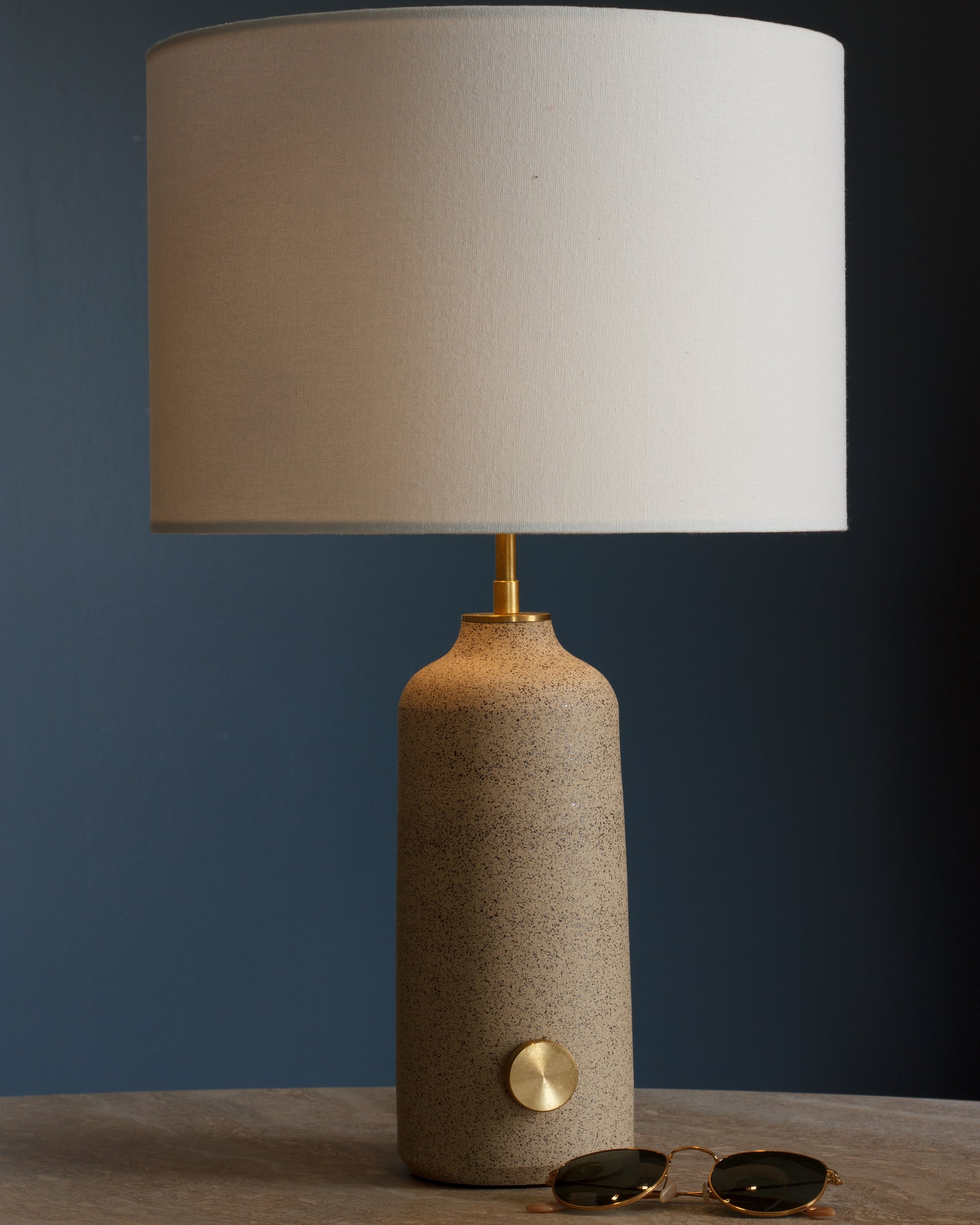 Lamp is a wheel thrown base, wired and assembled using solid brass hardware by Cameron. Each piece is one of a kind, signed by the artist.