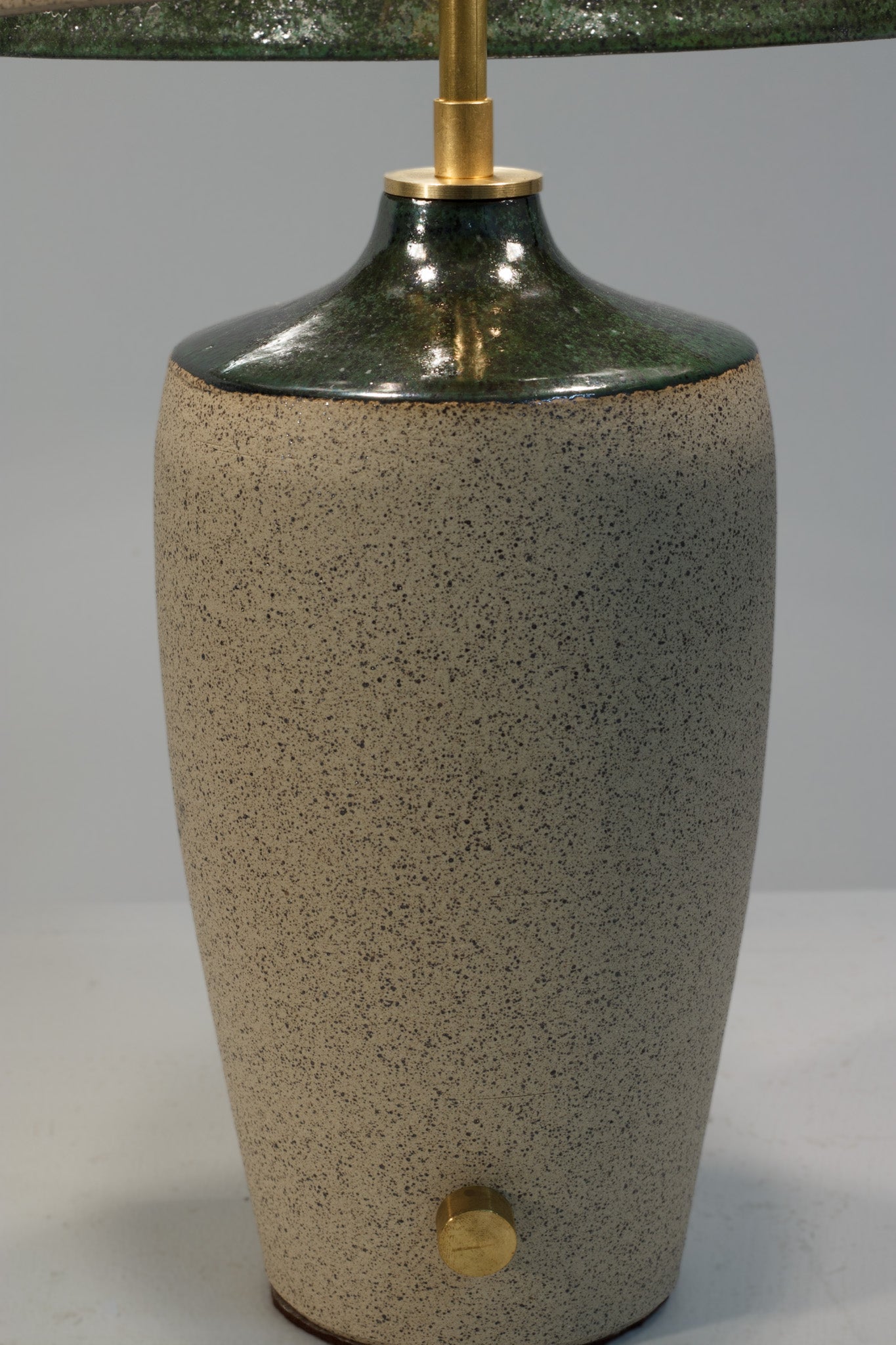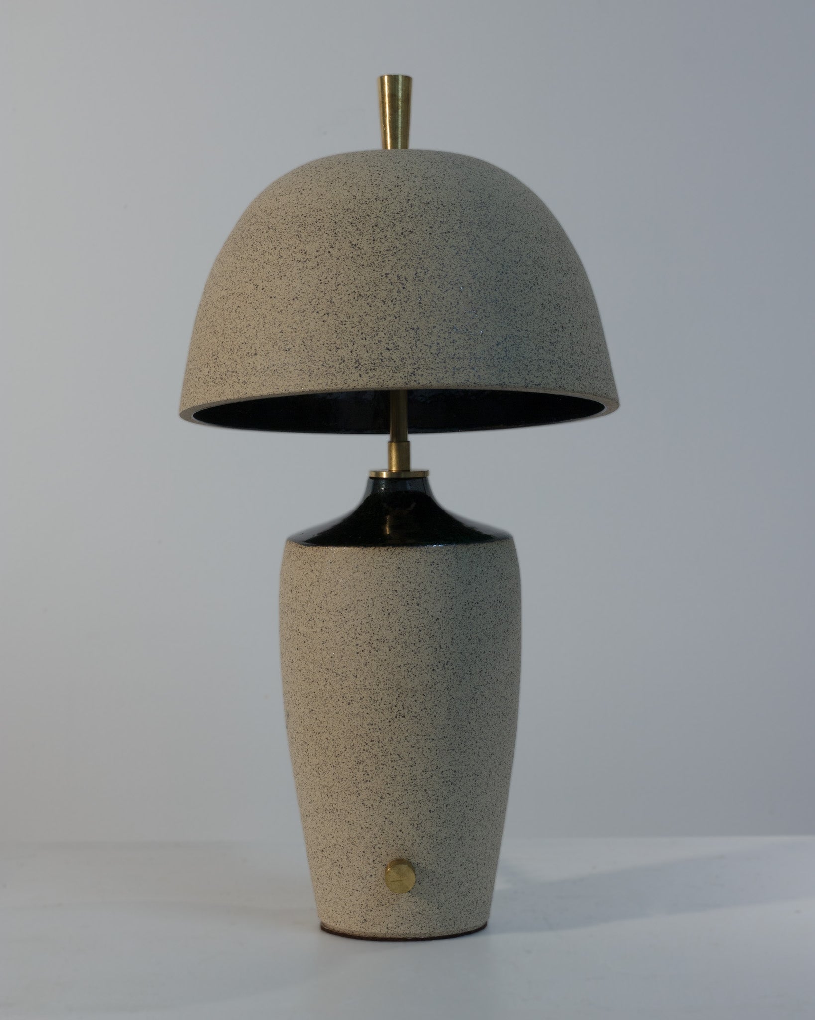 Lamp is a wheel thrown base & shade, wired and assembled using solid brass hardware by Cameron. Each piece is one of a kind, signed by the artist.